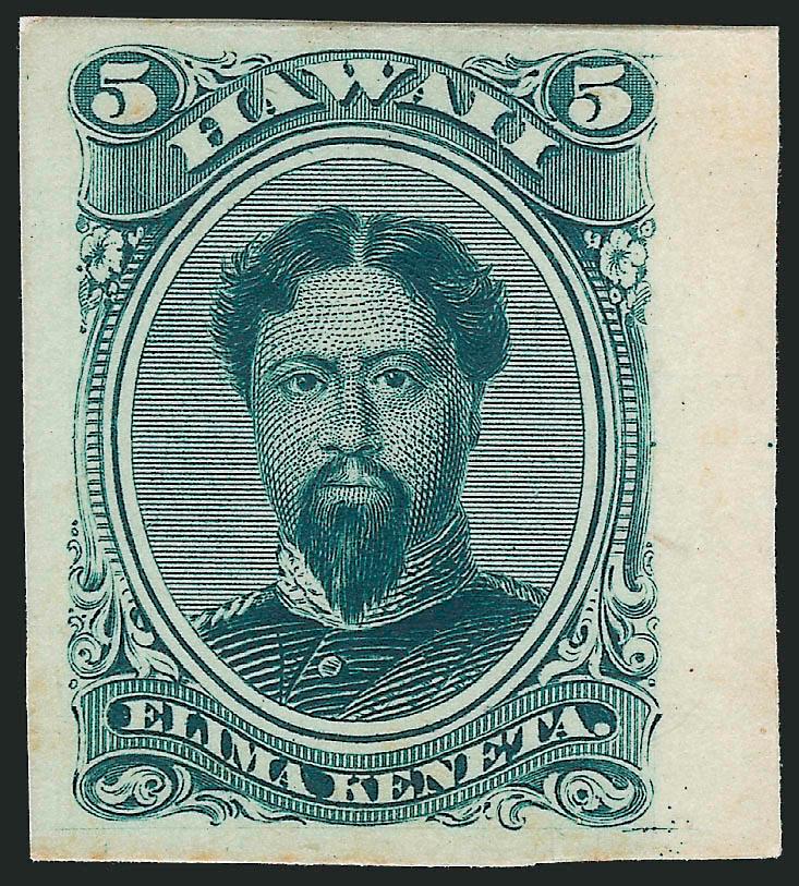 617° TC Image1866, 5c Kamehameha V, Trial Color Plate Proof on India (32TC3). Single in Green, affixed to original card backing, large margins incl. sheet margin at right, Extremely Fine (Image)