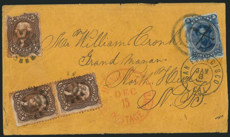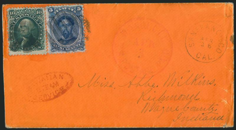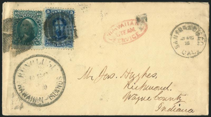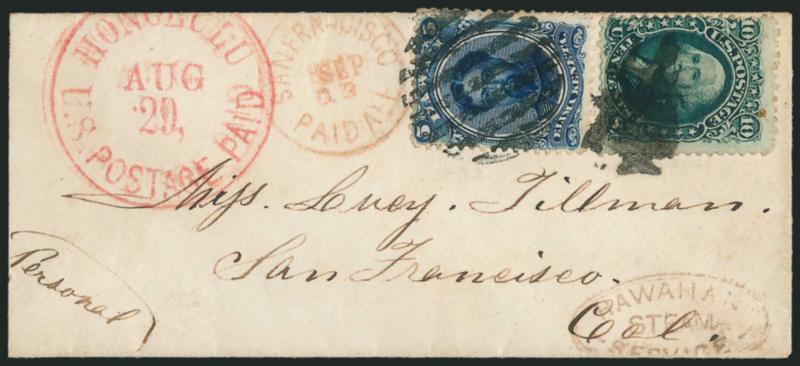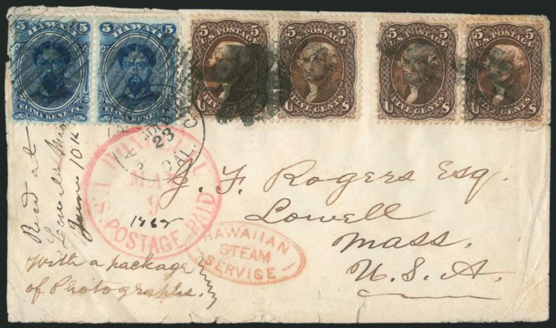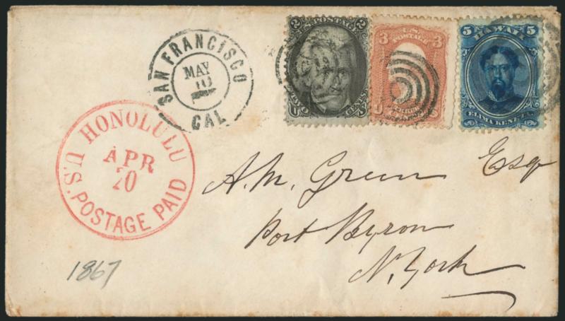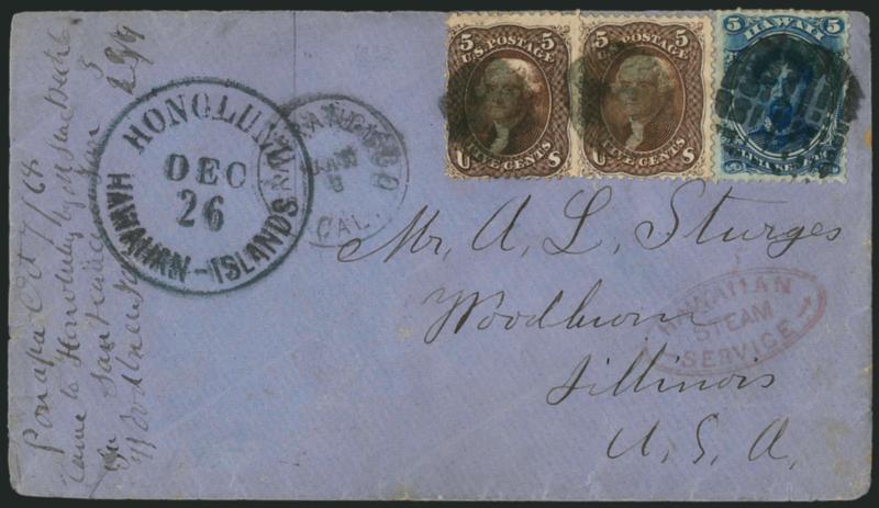 Very few U.S.-Hawaiian mixed-franking covers with the 2c Black Jack are known. This is a late treaty period usage, as the 5c/10c contract steamer rates became effective September 25, 1867. This cover was carried on the British bark Australind, which departed Honolulu on April 20, 1867, and arrived at San Francisco on May 9. (Image)