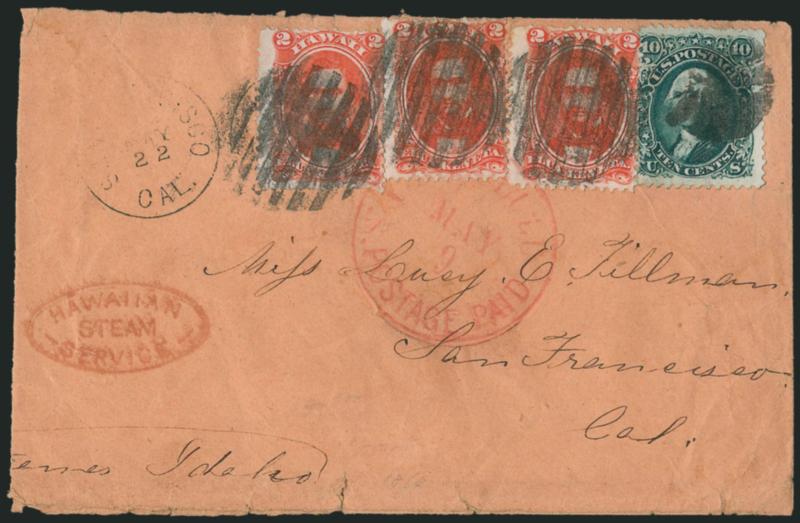 Michael Laurence, in his outstanding book on the 10c 1869 Issue, records only nine covers from Hawaii, all mixed frankings. This cover was carried on the COMSS Idaho on the third to last sailing of the contract steamer period, departing Honolulu on Apr. 21, 1870, and arriving at San Francisco on May 5.