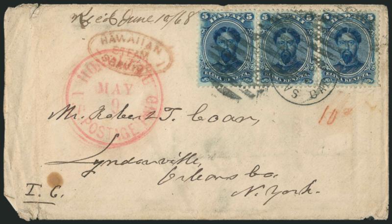 The docketing at bottom left indicates the cover carried photographs, which explains why it weighed more than one-half ounce. Only ten examples of the "Hawaiian Steam Service" handstamp are recorded on multiple-rate covers. According to www.hawaiianstamps.com, the "Hawaiian Steam Service" oval was applied regularly to contract letters from November 1867 to August 1869. This cover was carried on the COMSS Idaho, departing Honolulu on May 9, 1868, and arriving in San Francisco on May 22.