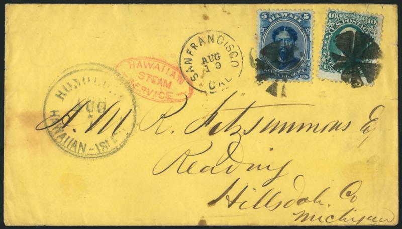 VERY FINE. A BEAUTIFUL AND RARE MIXED-FRANKING COVER BEARING THE HAWAIIAN 5-CENT KAMEHAMEHA V AND UNITED STATES 5-CENT 1863 ISSUES, WHICH ORIGINATED IN MICRONESIA AND WAS SENT THROUGH HONOLULU AND SAN FRANCISCO.