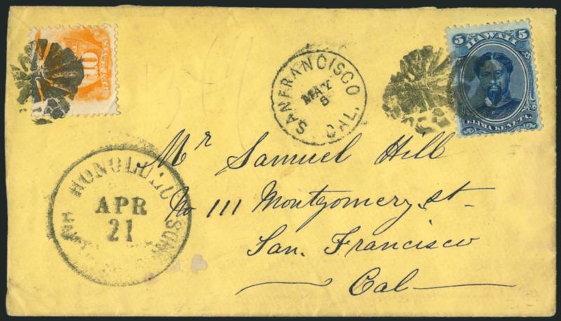 VERY FINE. A SPECTACULAR MIXED-FRANKING COVER WITH THE 1866 5-CENT KAMEHAMEHA V AND UNITED STATES 10-CENT 1869 PICTORIAL ISSUE. ONLY NINE COVERS BEARING A 10-CENT 1869 STAMP ARE RECORDED USED FROM HAWAII.