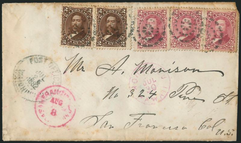666° c Image1875, 2c Brown, 2c Lilac Rose (35, 38). Horizontal pair of 2c Brown, used with pair and single of 2c Lilac Rose, tied by three-ring segmented target cancels, "Post Office Waiohinu, H.I. Jul. 26, 1882" and "Honolulu Hawaii Jul. 30" circular datestamp on cover to San Francisco, San Francisco receiving datestamp (Aug. 8), cover with soiling slightly affecting the stamps at top, right stamp small corner crease at top right, otherwise Fine, an unusual "all 2's" franking with two different colors (Image)
