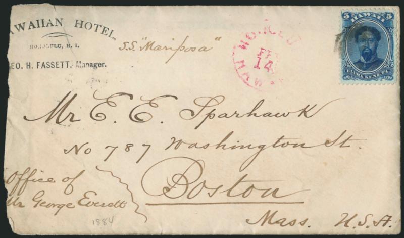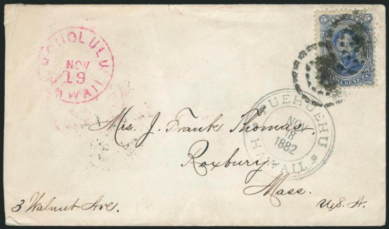 667° c Image1882, 5c Ultramarine (39). Tied by two strikes of three-ring segmented target cancel, "Puehuehu Hawaii Nov. 18, 1882" double-circle datestamp (Ty. 282.016, Scarcity 3) and red "Honolulu Hawaii Nov. 19" circular datestamp on cover to Roxbury Mass., San Francisco transit and Roxbury receiving backstamps, folded perf tip at top and cover with small edge tear at top left, otherwise Very Fine, scarce town postmark (especially struck on the front) (Image)