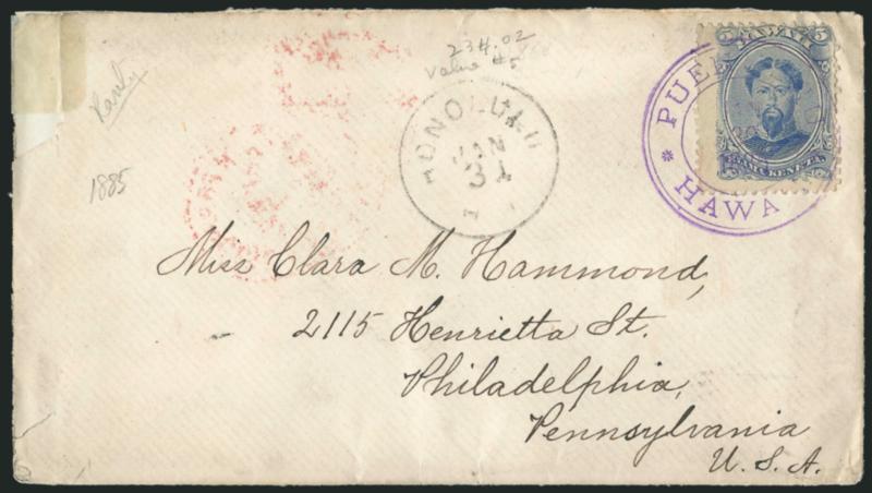 668° c Image1882, 5c Ultramarine (39). Perfs in, tied by bold strike of purple "Puehuehu Hawaii Jan. 30, 1885" double-circle datestamp (Ty. 282.016, Scarcity 3), "Honolulu H.I. Jan. 31" circular datestamp on cover to Philadelphia Pa., San Francisco transit and Philadelphia receiving backstamps, offsets of San Francisco transit datestamp on front, stamp and cover with minor faults, appears Fine, scarce town postmark (especially struck on the front, tying the stamp) (Image)