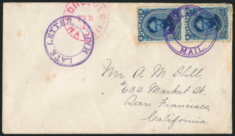 669° c Image1866, 5c Blue (32). Vertical pair, tied by perfect bold strike of "Late Letter. Mail." double-circle handstamp (Ty. 759, Rarity 1RRRR) with second strike at left, red "Honolulu Hawaii Feb. 1" (1884) circular datestamp on cover to San Francisco, receipt docketing on back, stamps with slight gum toning on perfs, otherwise Very Fine, a spectacular strike of this scarce marking, which was used to indicate payment of the extra fee for a letter that was brought to the Honolulu Post Office after the posted closing time for a mail shipment -- similar to U.S. Supplementary Mail, Gregory lists date range of use from Jul. 2, 1882, to Oct. 1, 1884 (Image)