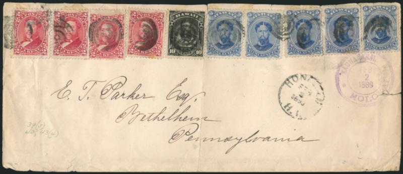 671° c Image1882, 10c Black (40). Single, used with five 5c Ultramarine and four 2c Rose (39, 43), stamps tied by multiple strikes of three-ring target cancel, purple "Kaunakakai Molokai Feb. 2, 1889" double-circle datestamp also ties righthand stamps on oversize cover to Bethlehem Pa., "Honolulu H.I. Feb. 3, 1889" datestamp, San Francisco transit and Bethlehem receiving datestamps on back, edgewear and tears, heavy central file fold, a few stamps with small faults near top from opening, still Fine appearance, the 43c in postage either overpays the 8-times 5c UPU rate, or alternatively, the 10c may be a replacement for a missing 2c stamp (35c rate) (Image)