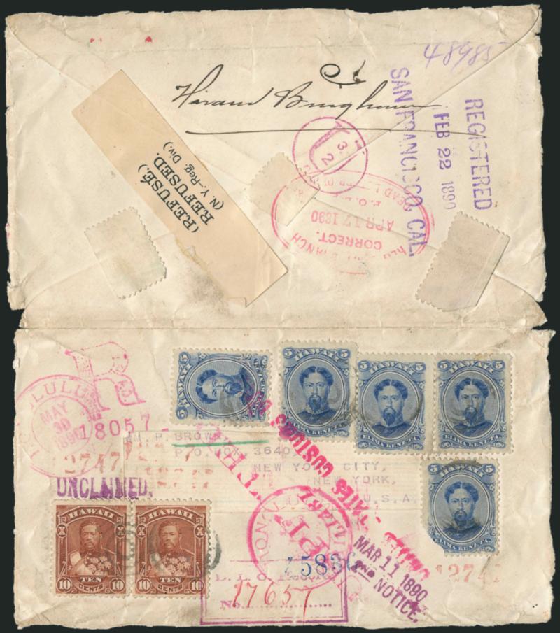 672° c Image1882, 5c Ultramarine, 10c Red Brown (39, 44). Five 5c singles and pair of 10c tied by target cancels, magenta "Honolulu Hawaii Feb. 13, 1890" double-circle datestamp on registered cover to New York, Honolulu "R" registry handstamp, San Francisco registry datetamp, red "Suspected Liable United States Customs Duties" handstamp, letter was refused by addressee and sent to the Dead Letter Office, variety of related markings incl. "Unclaimed", "2nd Notice", N.Y. "Refused" label, "D.L.O" boxed handstamp and "Dead Letter Office" oval, cover returned to Hawaii and received with May 30 Honolulu double-circle datestamp, opened for display, stamp selvage on back, one 5c stamp defective and couple other small stamp flaws, overall wear and edge nicks which is unsurprising considering its extensive journey and handling, undoubtedly this contained Hawaiian stamps and was stopped at U.S. Customs (Image)