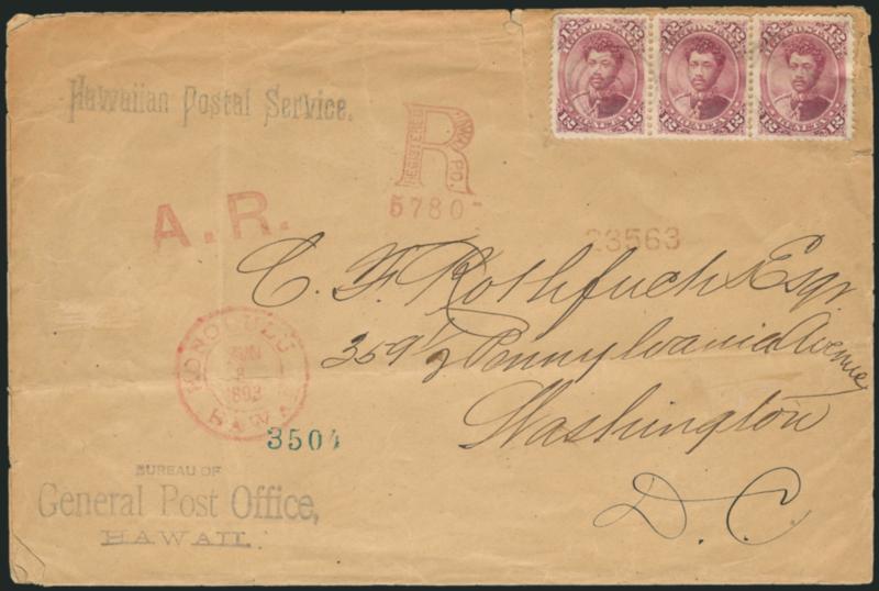 673° c Image1883, 12c Red Lilac (46). Horizontal strip of three, light target cancels, magenta "Honolulu Hawaii Aug. 8, 1893" double-circle datestamp on registered Hawaiian Postal Service corner card cover to stamp dealer Carl F. Rothfuchs in Washington D.C., magenta Honolulu "R" handstamp with matching "A.R." (indicating return receipt was purchased), registration numbers, San Francisco and Washington D.C. transit and receiving backstamps, few cover tears and some wear, right stamp wrinkling, appears Fine, attractive multiple-rate registered cover, during this period the registration fee was 10c plus 5c for the return receipt, Rothfuchs was a prominent dealer (Image)