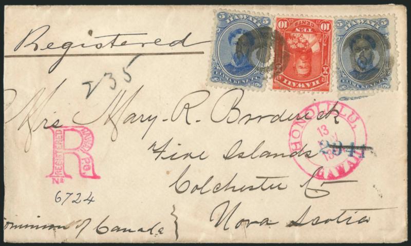 674° c Image1882, 5c Ultramarine, 10c Vermilion (39, 45). Two 5c, right stamp with portion of adjoining stamp at bottom, used with 10c, tied or cancelled by three-ring target, magenta "Honolulu Hawaii 13 Nov. 1884" double-circle datestamp with matching "R" registry handstamp on registered cover to Nova Scotia, Canada, numerous backstamps incl. San Francisco registered oval, "Boston, Mass. Registered Dec. 1, 1884" boxed handstamp, Canadian transits and Great Village Nova Scotia Dec. 3 receiving handstamp, also "F.A. Schaefer & Co. Commission Merchants Honolulu H.I." oval backstamp, right 5c stamp couple perf flaws at right, cover reduced at left, still Very Fine, a colorful franking paying the 5c UPU rate and 15c for registration with return receipt to Canada (Image)