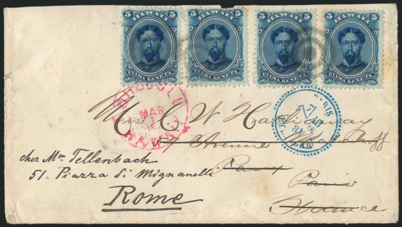 675° c Image1866, 5c Blue (32). Four singles, tied by target cancels and left stamp tied by "Honolulu Hawaii Mar. 1" (1884) circular datestamp on cover to Paris, France and forwarded to Rome, Italy, blue Paris circular datestamp also ties one stamp, numerous transit or receiving backstamps incl. New York, Paris and Rome, missing part of top flap and tear on back, one stamp small fault at top, otherwise Fine, an attractive double-rate franking (Image)