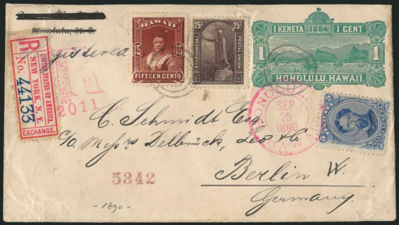 676° c Image1883, 25c Dark Violet (47). Tied by target cancels, used with 5c Ultramarine and 15c Red Brown (39, 41) on registered 1c Light Green entire (U1) to Berlin, Germany, magenta "Honolulu Hawaii Sep. 25, 1890" circular datestamp ties 5c stamp, matching Honolulu "R" handstamp, New York registry label, back with New York and San Francisco registered ovals, transit datestamps, blue "H. Hackfield & Co." backstamp, 25c stamp light corner crease, some minor edge wrinkling, otherwise Very Fine high-value franking (Image)