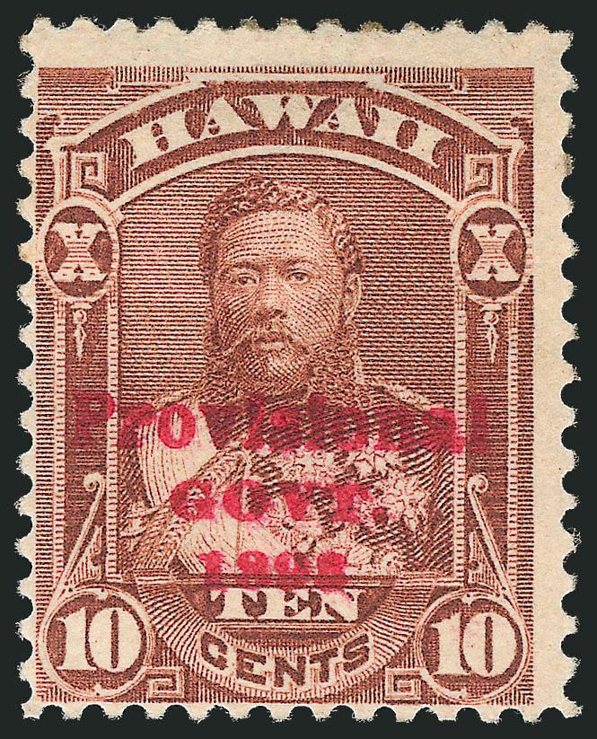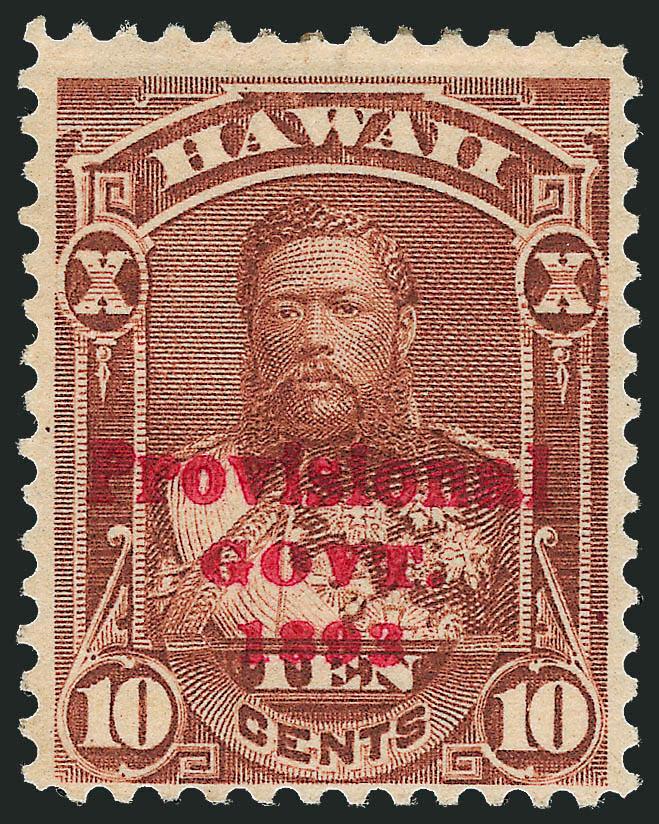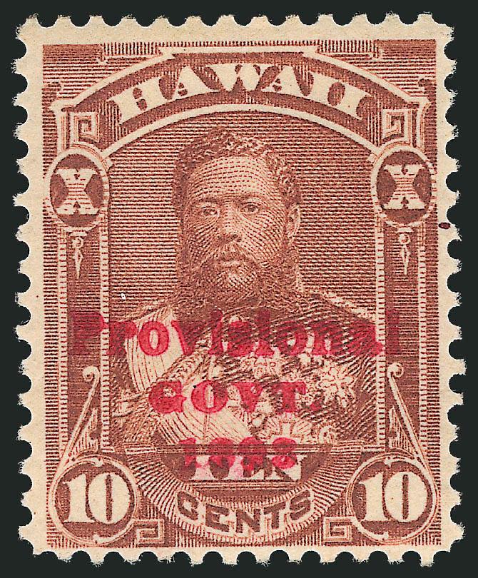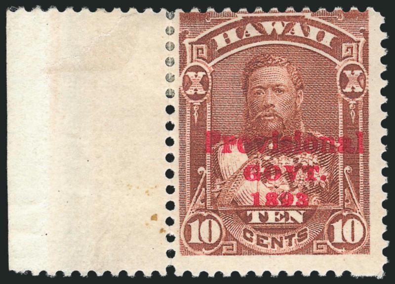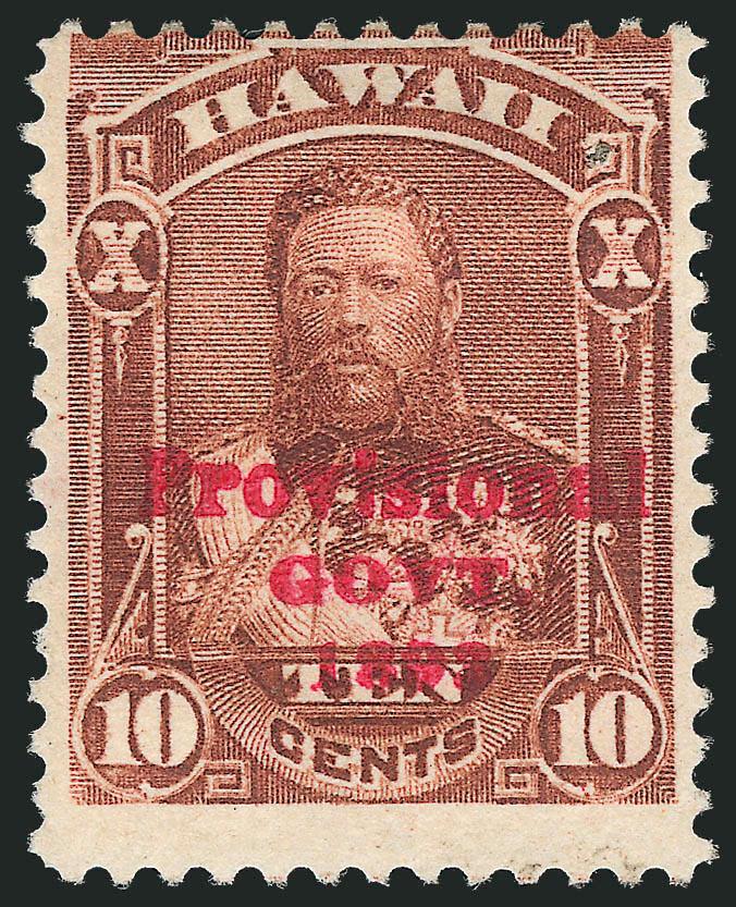 VERY FINE. AN EXTREMELY RARE SOUND ORIGINAL-GUM EXAMPLE OF THE 1893 10-CENT RED OVERPRINT ERROR. ONLY ONE SHEET OF FIFTY WAS ISSUED.
