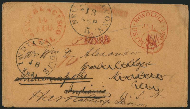 70° c ImageHonolulu*U.S. Postage Paid*Jul. 5. Red circular datestamp on ca. 1852 brown cover to William D. Alexander at Yale College in New Haven Conn. and forwarded twice, first to Indianapolis Ind. and then to Harrisburg Pa., red "San Francisco Cal. 14 Aug." circular datestamp with matching "Paid" and "8" in circle handstamps (6c plus 2c ship fee), "New Haven, Conn. 5 13 Sep" integral due rate datestamp, "Indianapolis Ind. Sep. 18" circular datestamp, red "Forwarded" straightline, red crayon 5c forwarding charge added to New Haven 5c due for 10c total, some edgewear, Very Fine, unusual cover to the future president of Oahu College (Image)