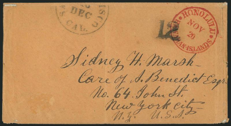 71° c ImageHonolulu*Hawaiian-Islands*Nov. 20 (1852). Bold perfect strike of red circular datestamp on brown cover to Sidney H. Marsh in New York City, "San Francisco Cal. 16 Dec." circular datestamp struck partly off top of cover, "12" due handstamp (10c collect plus 2c ship fee), carried on the Zoe, which departed Honolulu Nov. 22 and arrived in San Francisco Dec. 12, some edgewear, still Very Fine, ex Knapp (Image)