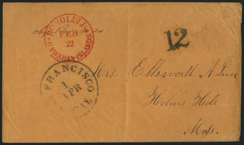 72° c ImageHonolulu*Hawaiian Islands*Feb. 22 (1853). Clear strike of circular datestamp on cover to Holmes Hole Mass., light "San Francisco Cal. 1 Apr." circular datestamp, "12" handstamp, carried on the Wallace, which departed Honolulu Feb. 23 and arrived in San Francisco Mar. 21, some wear and folds, still Very Fine (Image)