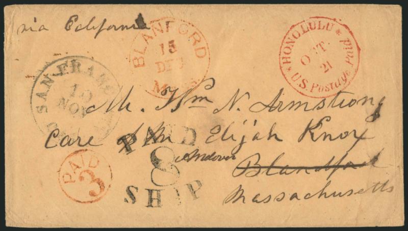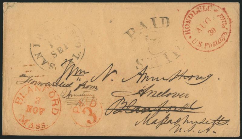 73° c ImageHonolulu*U.S. Postage Paid*Aug. 30 (1853). Red circular datestamp on brown cover to William N. Armstrong in Blanford Mass. and forwarded to Andover Mass., "San Francisco Cal. 19 Sep." circular datestamp and large "PAID/8/SHIP" handstamp, orange-red "Blanford Mass. 3 Nov." circular datestamp and matching "Paid 3" in circle handstamp, manuscript "Forwarded from" over datestamp, Very Fine, carried on the schooner E. L. Frost, which departed Honolulu Sep. 1 and arrived in San Francisco Aug. 19, this is the earliest recorded use of the "PAID/8/SHIP" handstamp, accompanied by a front only with Honolulu circular datestamp and same "PAID/8/SHIP" handstamp (Image)