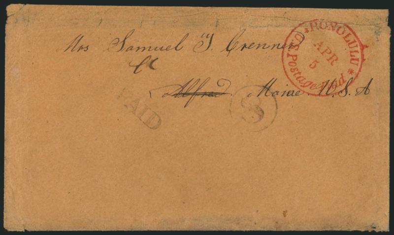 75° c ImageHonolulu*U.S. Postage Paid*Apr. 5 (1853). Two covers to Samuel Crenner in Alfred Me., each with clear strike of red circular datestamp of same date, neat "Paid" and "8" in circle handstamps (6c plus 2c ship fee), some overall wear and soiling, edge tears, still Fine-Very Fine, both carried on brig Zoe, which departed Honolulu Apr. 7 and arrived in San Francisco Apr. 25, curiously these covers were not datestamped in San Francisco (Image)