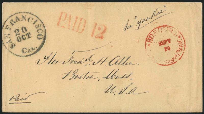 76° c ImageHonolulu*U.S. Postage Paid*Sept. 20 (1856). Partly clear red circular datestamp on cover to Hon. Frederick H. Allen in Boston, sender's ship-name directive "per Yankee", "San Francisco Cal. 20 Oct." circular datestamp, red "PAID 12" straightline handstamp (10c plus 2c ship fee), minor edgewear, Very Fine, carried on the New Granada brig Ellenita, which departed Honolulu Sep. 21 and arrived in San Francisco Oct. 13, signed Ashbrook (Image)