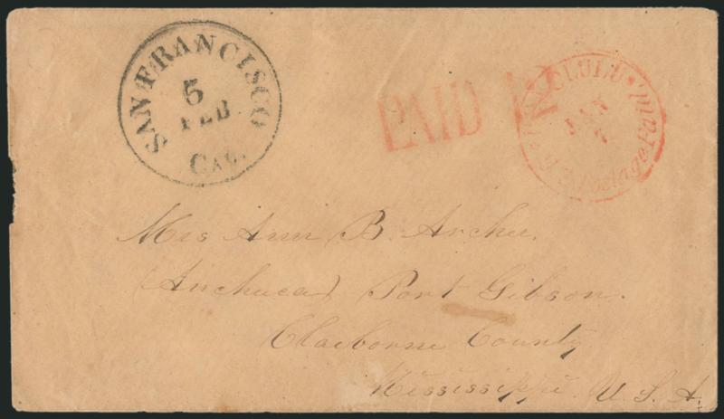 77° c ImageHonolulu*U.S. Postage Paid*Jan. 7 (1854). Light strike of red circular datestamp on brown cover to Miss Ann B. Archer in Port Gibson Miss., neat "San Francisco Cal. 5 Feb." circular datestamp, red "PAID 12" straightline handstamp (10c plus 2c ship fee), some slight edgewear, Very Fine use to a scarce destination, carried on the E. L. Frost, which departed Honolulu Jan. 7 and arrived in San Francisco Jan. 31 (Image)