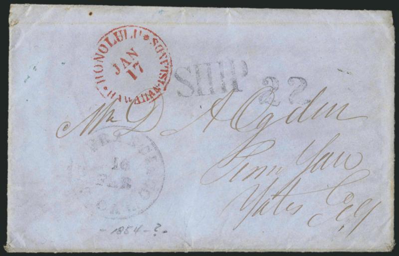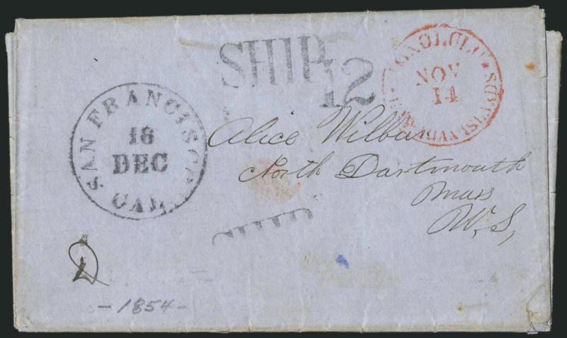 80° c ImageHonolulu*Hawaiian Islands*Nov. 14 (1854). Red circular datestamp on blue folded letter to Alice Wilbur in North Dartmouth Mass., neat "San Francisco Cal. 16 Dec." circular datestamp, "SHIP" and "12" handstamps (10c collect plus 2c ship fee), minor wear, Very Fine, carried on the Lady Jane, which departed Honolulu Nov. 14 and arrived in San Francisco Dec. 8 (Image)