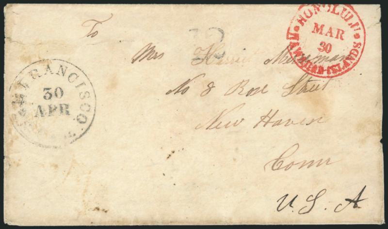79° c ImageHonolulu*Hawaiian Islands*Mar. 30 (1854). Bold red circular datestamp on cover to Mrs. Harriet Merriman in New Haven Conn., light "San Francisco Cal. 30 Apr." circular datestamp, "12" rate handstamp (10c collect plus 2c ship fee), some soiling and tears, otherwise Very Fine, carried on the Restless, which departed Honolulu Mar. 31 and arrived in San Francisco Apr. 17 (Image)