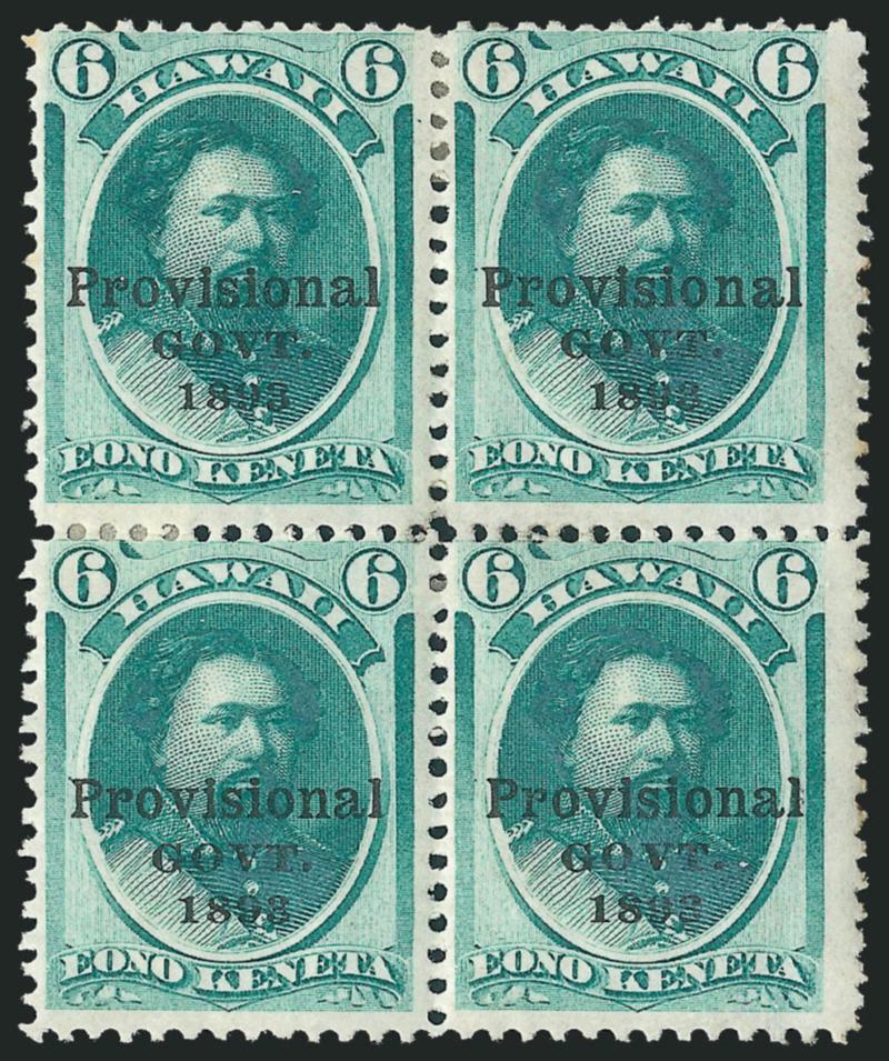 FINE APPEARANCE. ONE OF ONLY TWO RECORDED BLOCKS OF FOUR OF THE 1893 6-CENT PROVISIONAL GOVERNMENT OVERPRINT ERROR -- THIS IS THE LARGEST RECORDED MULTIPLE.