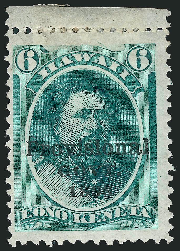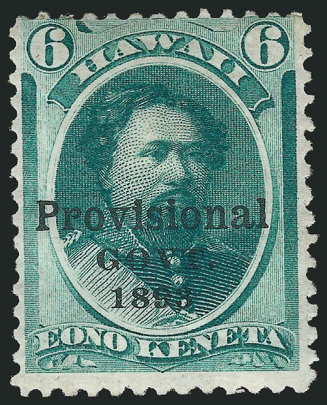 Two errors of the 1893 Provisional Government Overprint Issues were made. One sheet of the 10c Red Brown, normally overprinted in black, was overprinted in red (Scott 61B). One sheet of the 6c Green, normally overprinted in red, was overprinted in black (Scott 66C). According to an affidavit by Louis T. Kenake, clerk of the Stamp Division of the Republic of Hawaii, the 10c sheet was issued to the postmaster at Kahuka, Oahu (Meyer-Harris, p. 240). The 6c sheet was purchased by Postmaster Jos. M. Oat and sometime around 1901 most of it was sold to dealer J. H. Makins, probably on behalf of Henry J. Crocker. The San Francisco earthquake is said to have destroyed a number of examples of both the overprint errors.