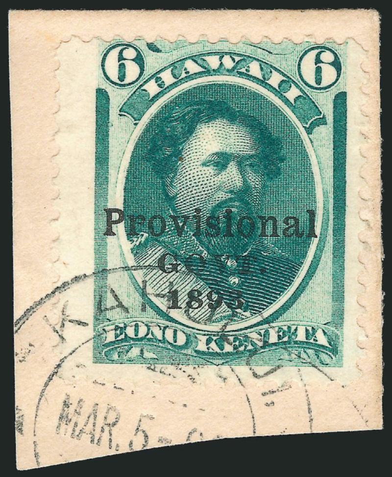 FINE. ONE OF ONLY SIX RECORDED USED EXAMPLES OF THE 1893 6-CENT BLACK OVERPRINT ERROR. AN EXCEPTIONAL HAWAIIAN PHILATELIC RARITY.