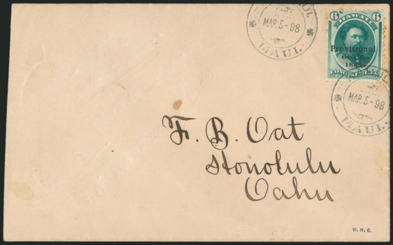 VERY FINE. THIS IS THE UNIQUE ON-COVER EXAMPLE OF THE 1893 6-CENT BLACK PROVISIONAL OVERPRINT ERROR. ONE OF THE MOST IMPORTANT ITEMS IN HAWAIIAN PHILATELY AND OFFERED TO THE MARKET FOR THE FIRST TIME SINCE THE 1954 ADMIRAL HARRIS SALE.