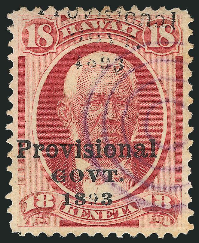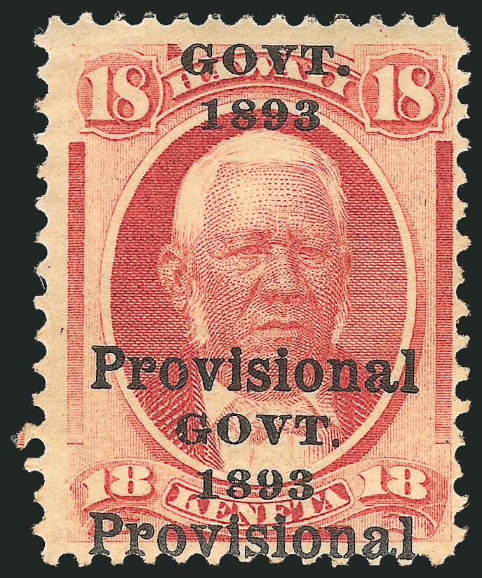 752°   Image1893, 18c Dull Rose, Category III Double Black Ovpt. (71f). Neat blue four-ring target cancel, clear second overprint at top, wide nicely balanced margins, Very Fine and choice, a premium example of this double overprint variety, with 1978 P.F. certificate, listed but unpriced in Scott as used (Image)