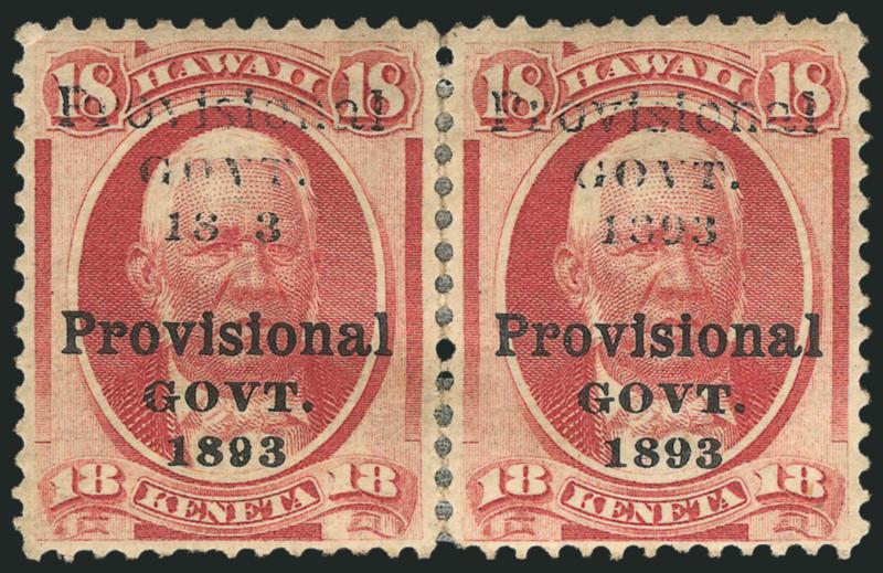 751° og Image1893, 18c Dull Rose, Category III Double Black Ovpt. with "18 3" Instead of "1893" (71f var). Horizontal pair, separated and rejoined with hinges, original gum, second overprint on left stamp the missing "9" variety, tiny corner crease on left stamp, otherwise Very Fine, a fascinating "double error" variety, the "18 3" variety unlisted for the double overprint (Image)