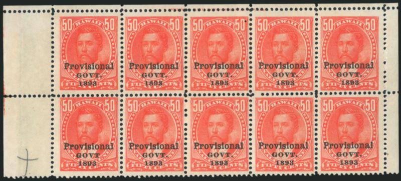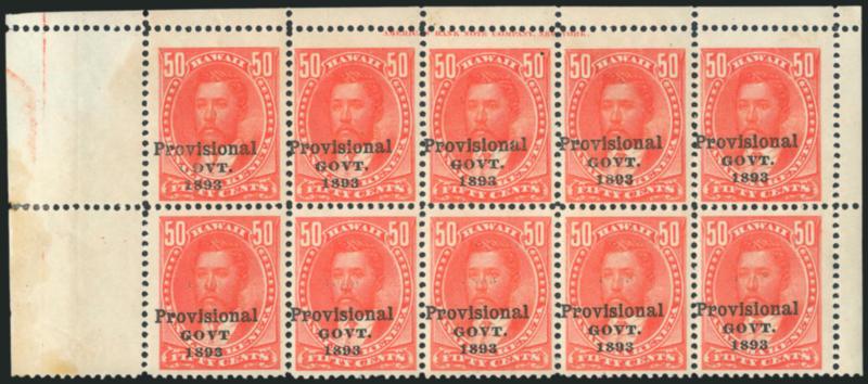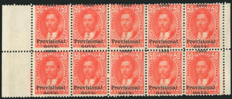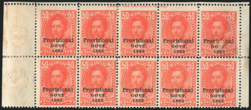 756° ogbl Image1893, 50c Red, Black Ovpt. (72). Block of ten with part imprint selvage at sides, eight stamps Mint N.H., two small h.r., overprint shifted vertically resulting in split between top and bottom, bright color, overall Fine with a couple Very Fine, Scott Retail as Mint N.H. and hinged singles (Image)