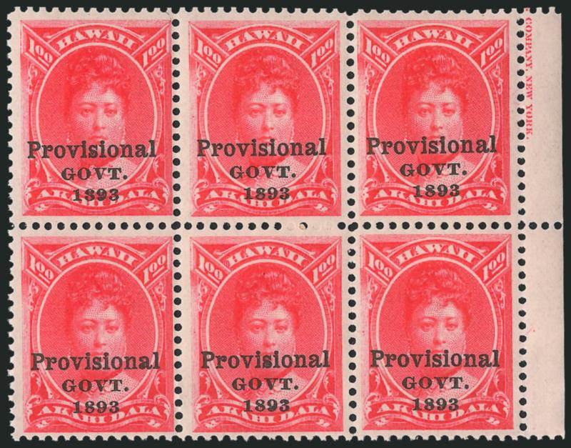 759° ogbl Image1893, $1.00 Rose Red, Black Ovpt. (73). Horizontal block of six with part imprint selvage at right, five stamps Mint N.H., top right stamp small h.r., vivid color and well-centered, light horizontal paper bend at bottom, left pair Fine, right part imprint block Very Fine, Scott Retail as singles (Image)