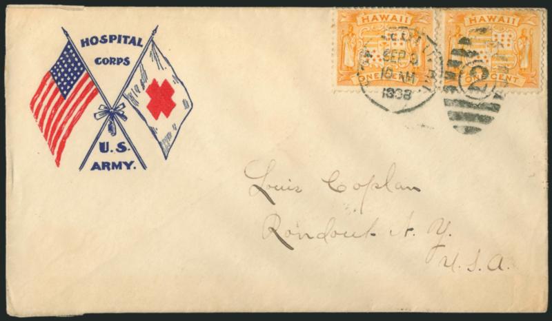 794° c Image1894, 1c Yellow (74). Two singles, tied by "Honolulu H.I. Sep. 3, 1898" duplex datestamp on cover to to Roundout N.Y. with "Hospital Corps U.S. Army." corner card depicting U.S. and red cross flags, San Francisco transit and Kingston N.Y. receiving backstamps, some perf toning and minor adhesive stains on back, still Very Fine, a beautiful and scarce cover paying the 2c rate for soldier's mail to the United States which became effective on August 12, 1898 (Image)