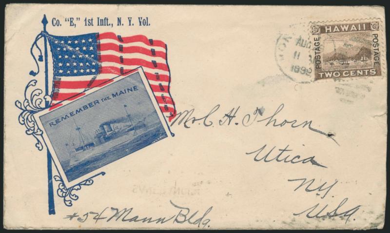 795° c Image1894, 2c Brown (75). Tied by "Honolulu H.I. Aug. 26, 1898" duplex datestamp on red and blue "Remember the Maine" Spanish-American War Patriotic cover to Utica N.Y., "Co. 'E,' 1st Inft., N.Y. Vol." imprint at top, San Francisco transit and Utica receiving backstamps, some cover soiling and small hole in address, otherwise Very Fine, a desirable patriotic cover paying the 2c rate for soldier's mail to the United States which had become effective two weeks prior on August 12, 1898, the N.Y. 1st Infantry was assigned to garrison duty in Honolulu during August and September 1898 before being recalled in December (Image)