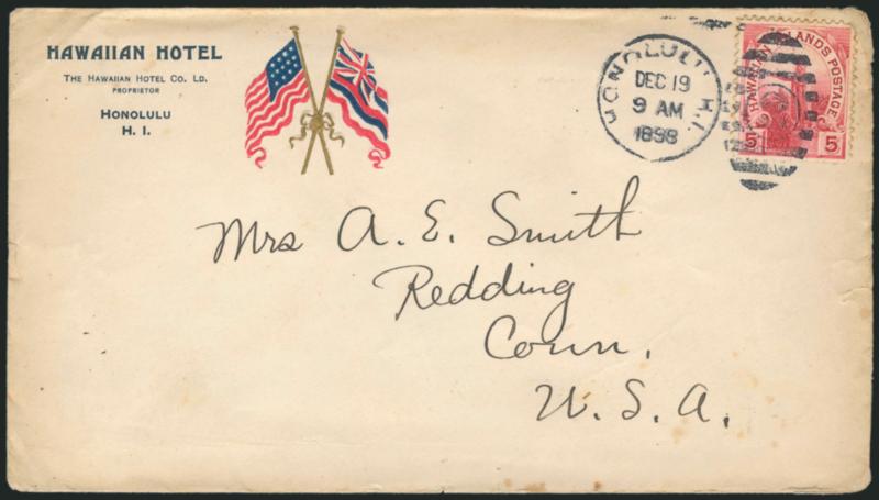 796° c Image1894, 5c Rose Lake (76). Tied by "Honolulu H.I. Dec. 19, 1898" duplex datestamp on cover to Redding Conn. with Hawaiian Hotel corner card and red, blue and gold embossed U.S. and Hawaiian flags, San Francisco transit on back, stamp with slight perf toning and rounded corner at top right, tiny cover edge tear, still Very Fine, a beautiful and rare three-color patriotic design, the use of which coincides with both the Spanish-American War and Hawaii's annexation to the U.S. (Image)