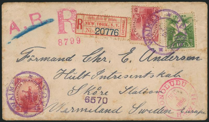 797° c Image1894, 10c Yellow Green (77). Used with two 5c Rose Lake (76) and tied by purple "Waimea Kauai 2 Dec. 1896" double-circle datestamps, magenta "Honolulu Hawaii Dec. 4, 1896" double-circle datestamp with matching "R" and "A.R." on registered cover to Wermland, Sweden, New York registry label ties one 5c stamp, San Francisco and New York registered backstamps, overall toning, still Fine and attractive registered use correctly paying the 5c UPU rate and 15c for registered plus return receipt (Image)