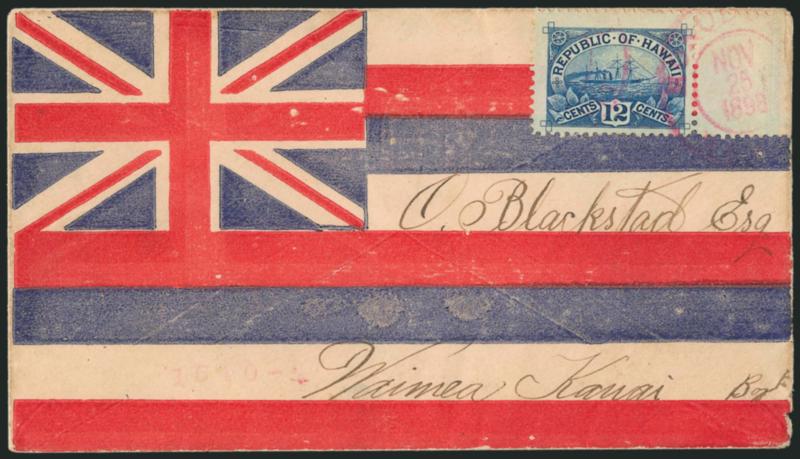 798° c Image1894, 12c Blue (78). Rich color, attached selvage at right, tied by "Honolulu Hawaii Nov. 25, 1898" double-circle datestamp on red and blue overall Hawaiian Flag Patriotic cover to Waimea, Kauai, Extremely Fine, a spectacular and very rare design, the use of which coincides with both the Spanish-American War and Hawaii's annexation to the U.S. (Image)