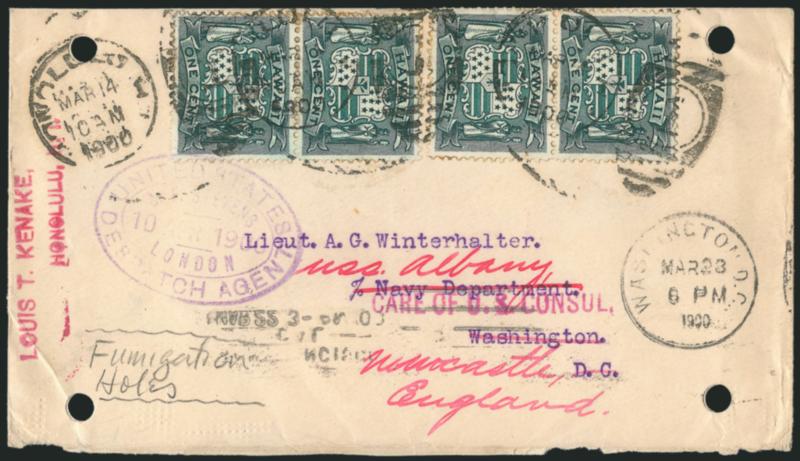 800° c Image1899, 1c Dark Green (80). Vertical strip of four and horizontal block of six (affixed to back), tied by "Honolulu H.I. Mar. 14, 1900" duplex datestamps on cover with hole punch in corners for fumigation against bubonic plague, sent to Washington D.C. and forwarded to Newcastle, England, endorsed "U.S.S. Albany", with "Care of U.S. Consul" straightline handstamp, San Francisco transit and Washington D.C. receiving datestamps, purple B.F. Stevens Despatch Agent oval, couple nicks where opened at bottom and minor gum toning on perfs, Very Fine, a fascinating double-rate cover, fumigated covers most often have corners clipped, this four-corner hole punch is unusual (Image)