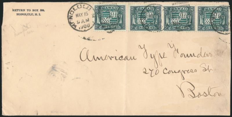 801° c Image1899, 1c Dark Green (80). Horizontal strip of three and single, tied by "Honolulu H.I. May 15, 1900" duplex datestamp on cover to Boston fumigated against bubonic plague, top left corner clipped, San Francisco transit and Boston receiving backstamps, slightly reduced at right, central file fold does not affect stamps, soiling at right, otherwise Fine (Image)