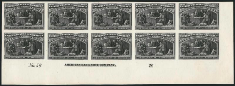 Ex Schwartz. Scott Catalogue only lists trial color plate proofs in Black for the 30c Columbian. The only other trial color listed for the 30c is a Sepia large die proof printed directly on card. They do not price multiples. Scott Retail as ten singles with no premium for the position or the multiple. (Image)