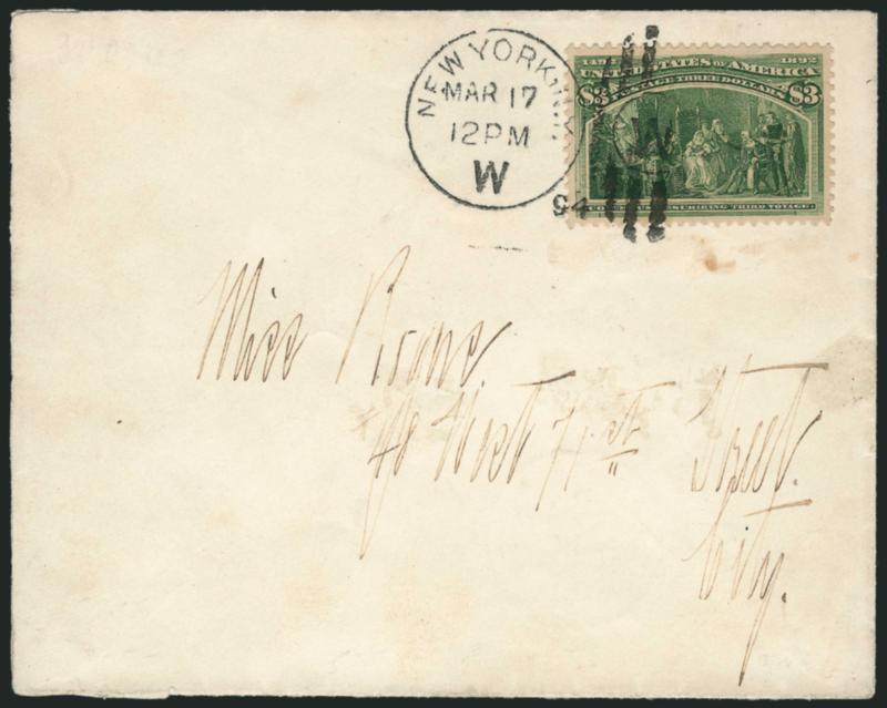 EXTREMELY FINE GEM. A SUPERB USED EXAMPLE OF THE $3.00 COLUMBIAN IN THE OLIVE GREEN SUB-SHADE.