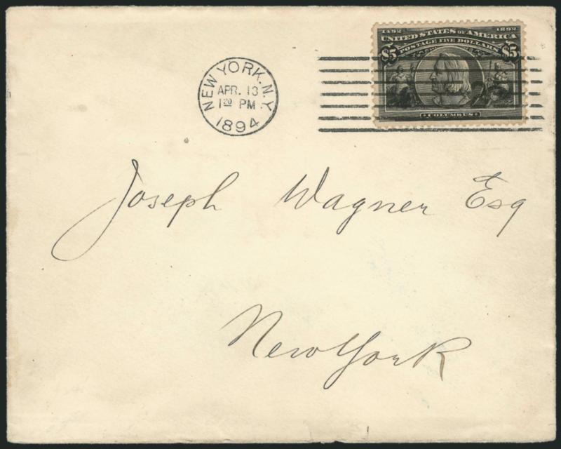 EXTREMELY FINE GEM. A SUPERB EXAMPLE OF THE $5.00 COLUMBIAN ISSUE ON COVER. EASILY ONE OF THE FINEST EXTANT.