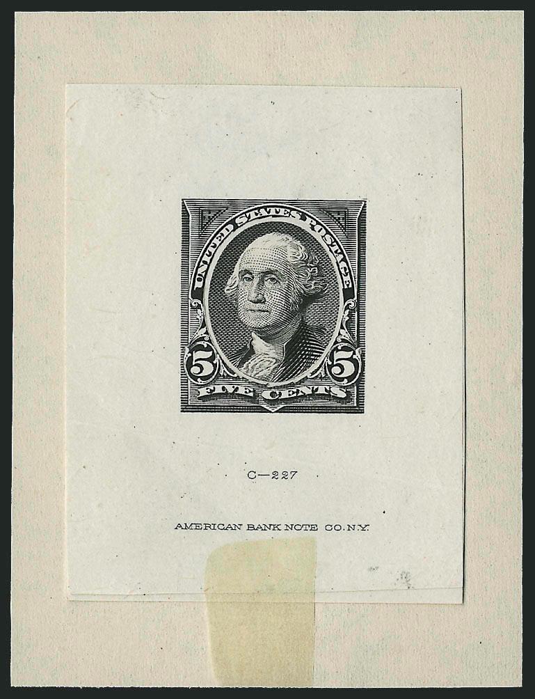VERY FINE. THE UNIQUE COMPOSITE ESSAY OF THE 5-CENT BUREAU ISSUE, COMBINING THE FRAME OF THE 5-CENT AND AN UNADOPTED DESIGN OF GEORGE WASHINGTON FOR THE VIGNETTE. A WONDERFUL RARITY.