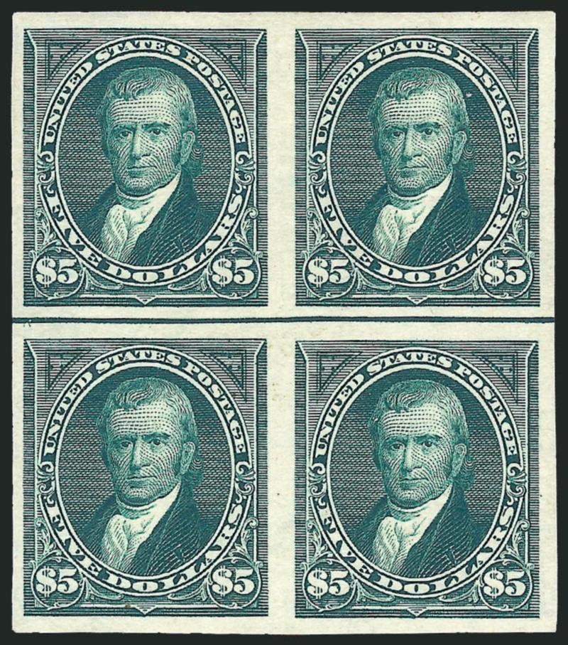 EXTREMELY FINE. A BEAUTIFUL ORIGINAL-GUM BLOCK OF FOUR OF THE IMPERFORATE 1895 $5.00 WATERMARKED BUREAU ISSUE.