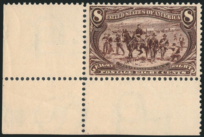 8c Trans-Mississippi (289). Mint N.H. with huge bottom left corner sheet selvage, choice centering with wide margins, intense shade and proof-like impressionEXTREMELY FINE GEM. A