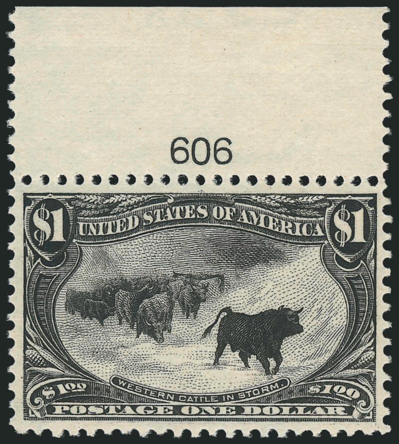 $1.00 Trans-Mississippi (292). Mint N.H. with plate no. 606 at top, intense shade on bright paper, detailed impressionEXTREMELY FINE. A GORGEOUS MINT NEVER-HINGED EXAMPLE OF THE $1.00