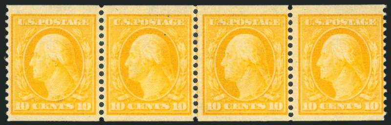 VERY FINE AND CHOICE. A BEAUTIFUL AND RARE SOUND GUIDE LINE STRIP OF FOUR OF THE 10-CENT HORIZONTAL COIL, SCOTT 356.