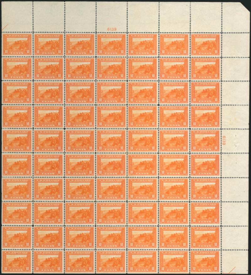 VERY FINE-EXTREMELY FINE. A STUNNING INTACT PANE OF 70 OF THE 1913 10-CENT ORANGE PERF 12 PANAMA-PACIFIC ISSUE.